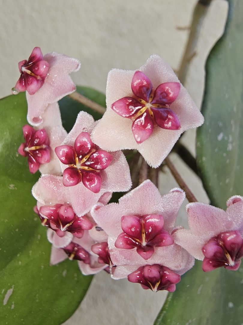 De folhas redondinhas e relativamente grandes, a Hoya obovata é uma espécie muito fácil de cuidar, que necessita de algum espaço para crescer, já que é uma planta com caule e folhas robustas. As flores são uma fofura!